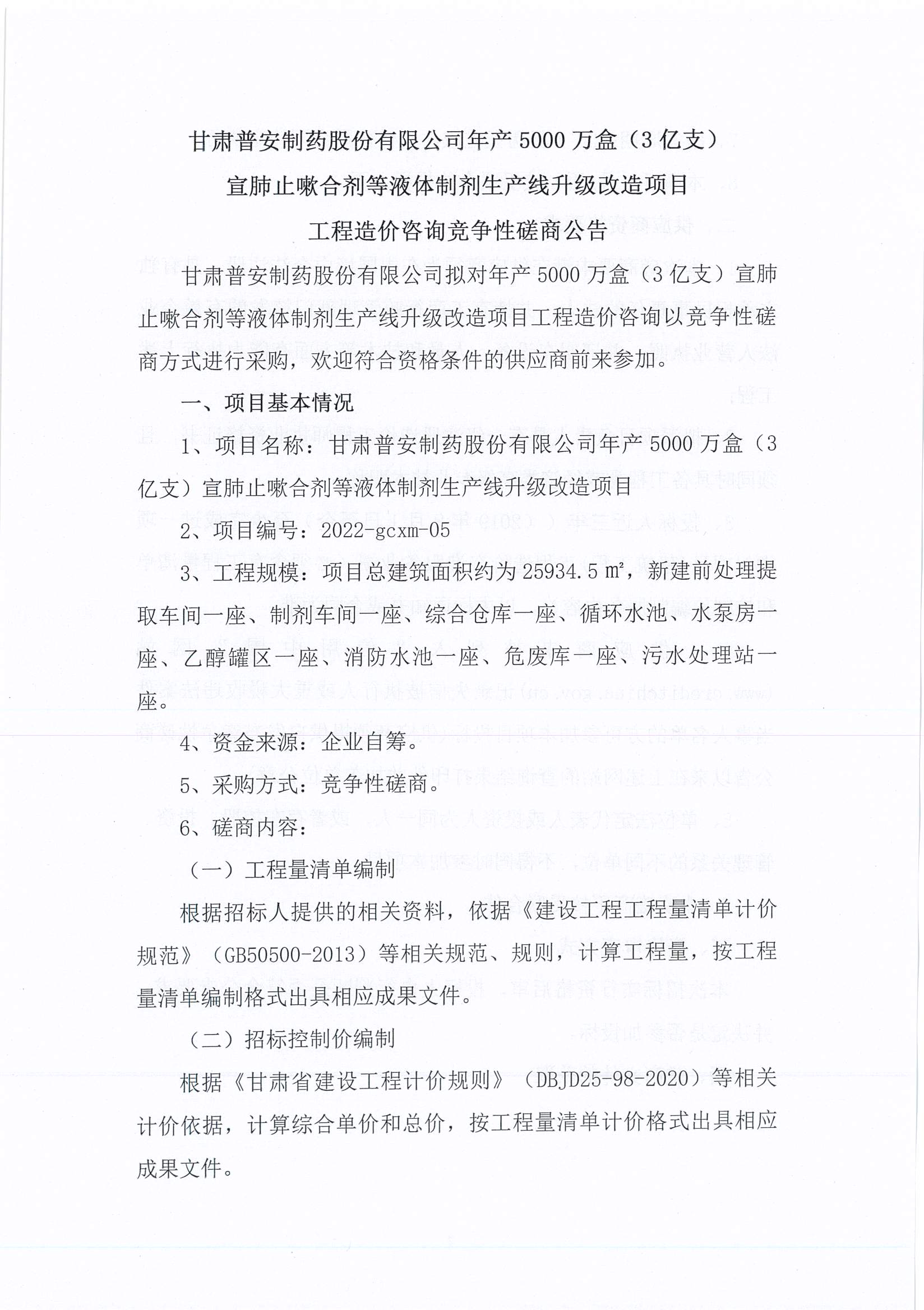 甘肅普安制藥股份有限公司年產(chǎn)5000萬(wàn)盒(3億支)宣肺止嗽合劑等液體制劑生產(chǎn)線升級(jí)改造項(xiàng)目工程造價(jià)咨詢競(jìng)爭(zhēng)性磋商公告