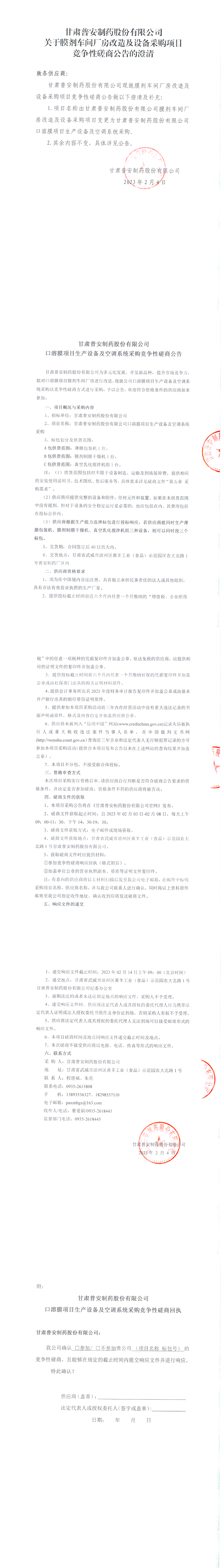 甘肅普安制藥股份有限公司關(guān)于膜劑車間廠房改造及設(shè)備采購項目競爭性磋商公告的澄清