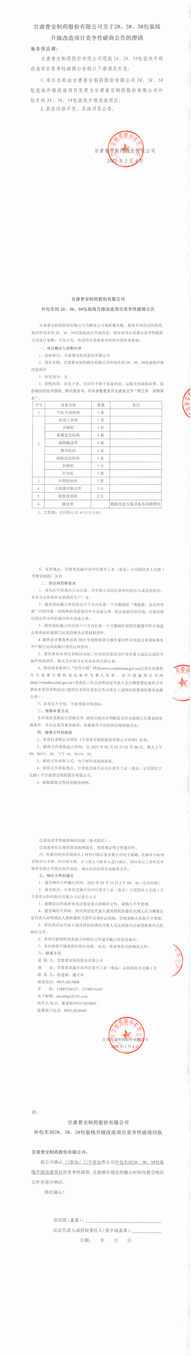 甘肅普安制藥股份有限公司關于2#、3#、5#包裝線升級改造項目競爭性磋商公告的澄清