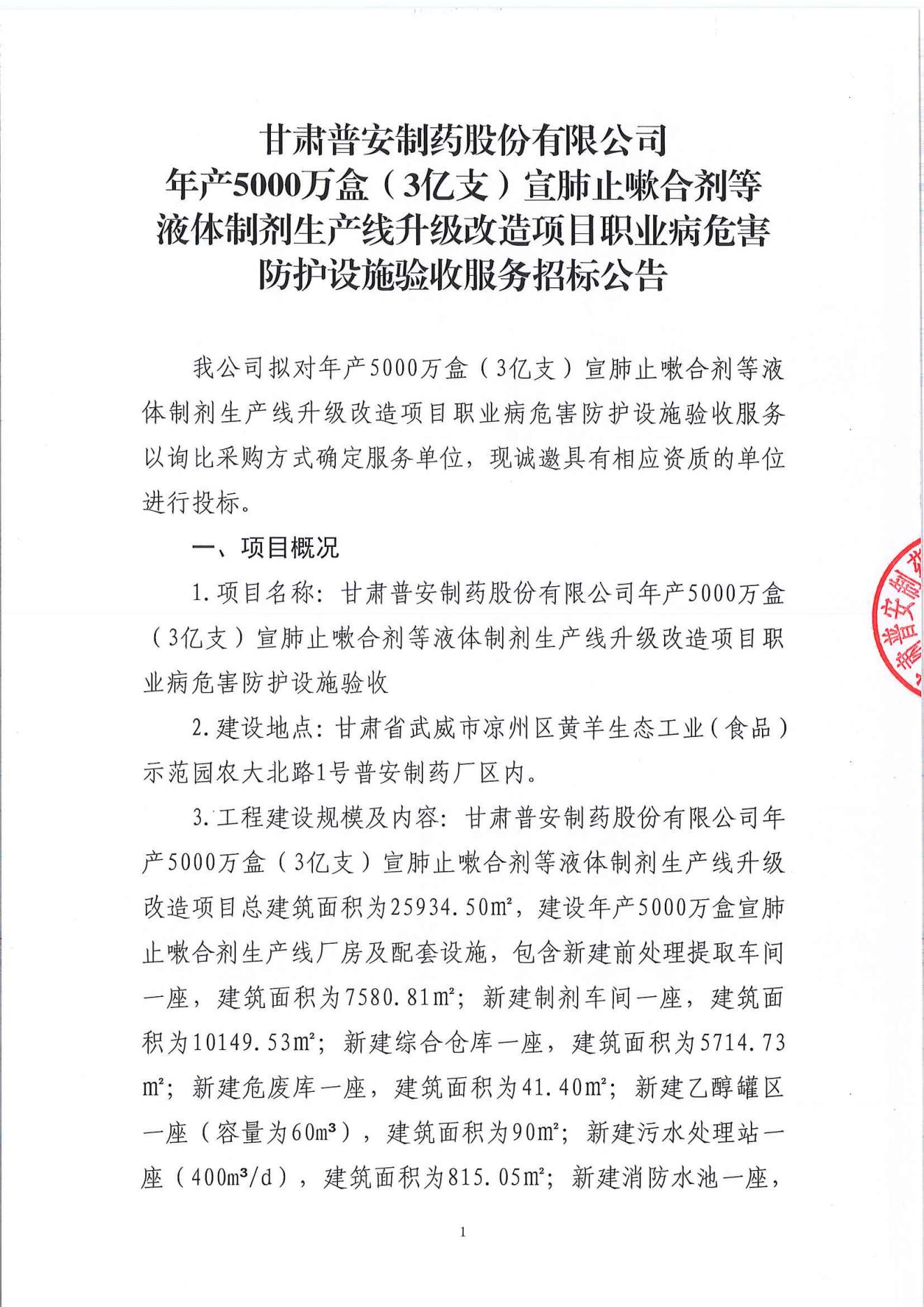 甘肅普安制藥股份有限公司年產5000萬盒(3億支)宣肺止嗽合劑等液體制劑生產線升級改造項目職業病危害防護設施驗收服務招標公告