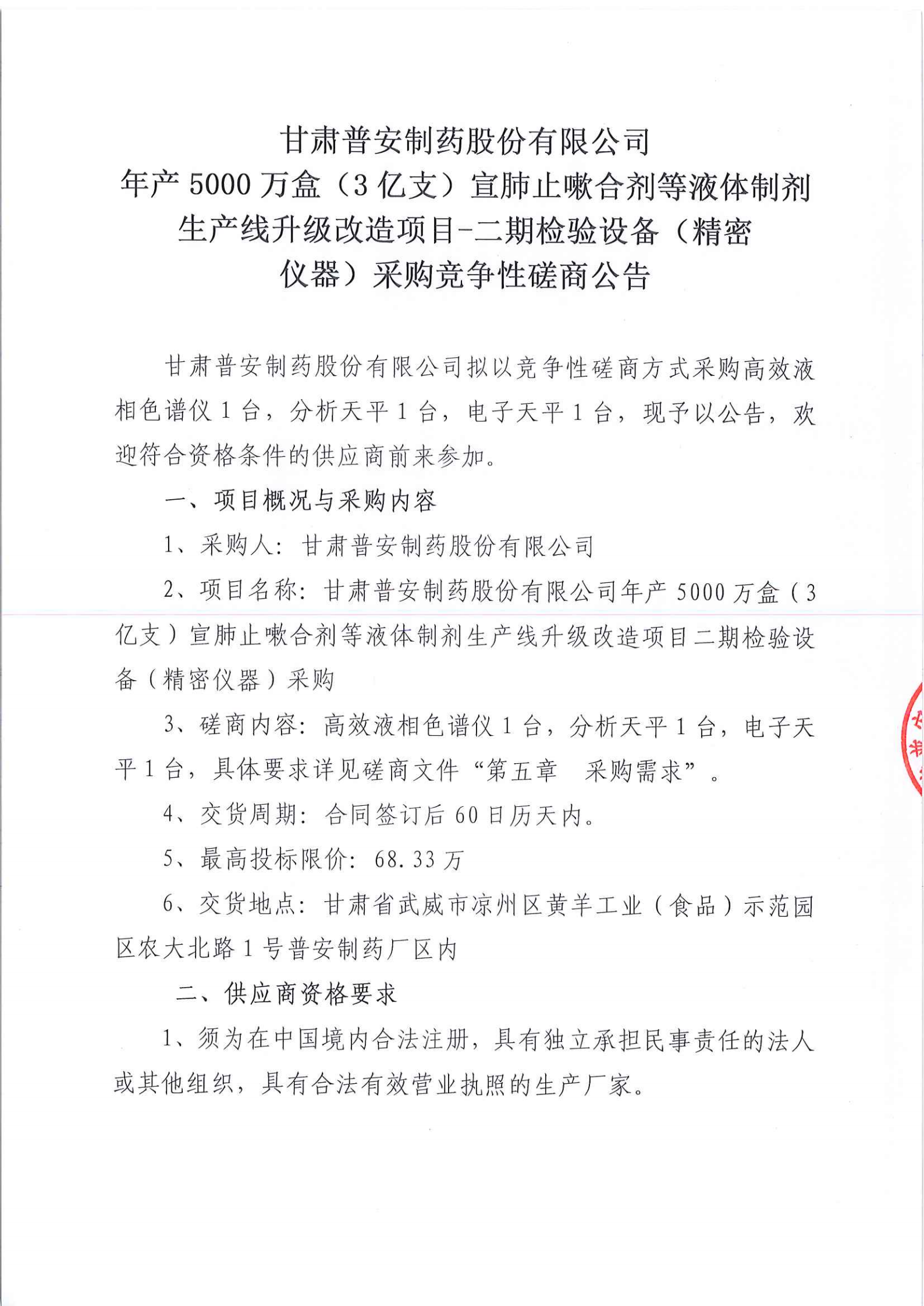 甘肅普安制藥股份有限公司年產5000萬盒(3億支)宣肺止嗽合劑等液體制劑生產線升級改造項目二期檢驗設備(精密儀器)采購競爭性磋商公告