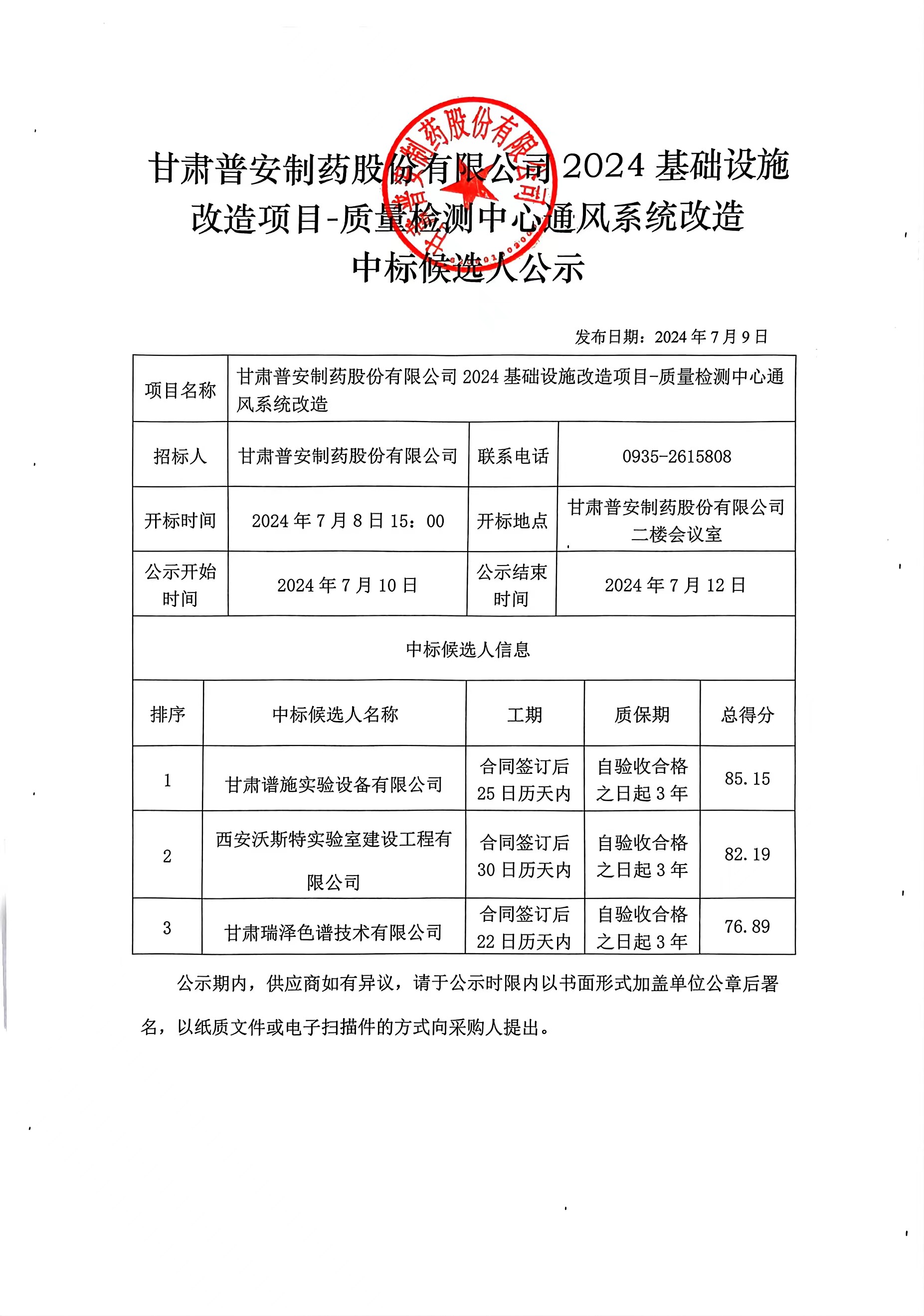 甘肅普安制藥股份有限公司2024年基礎(chǔ)設(shè)施改造項(xiàng)目-質(zhì)量檢測中心通風(fēng)系統(tǒng)改造中標(biāo)候選人公示