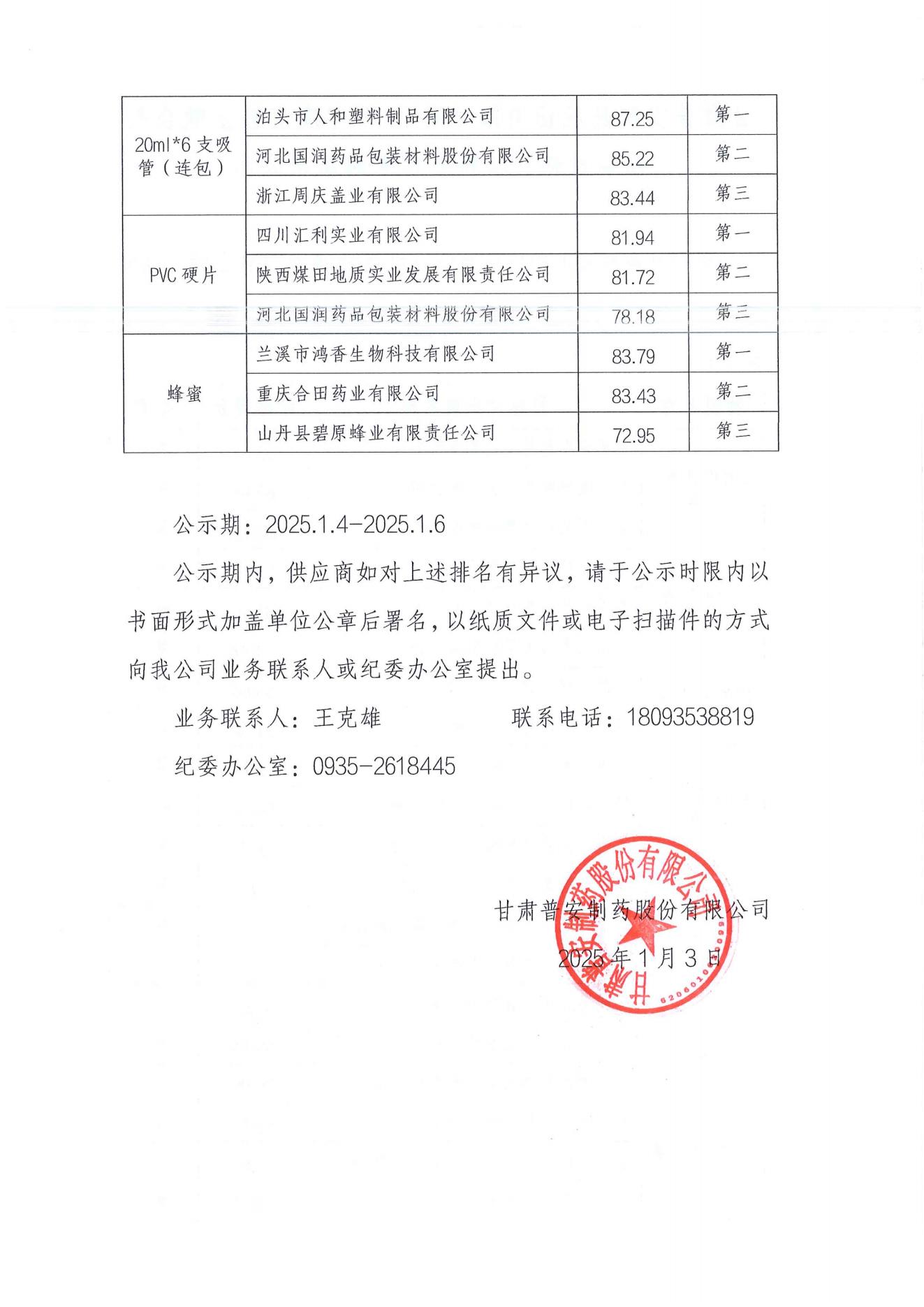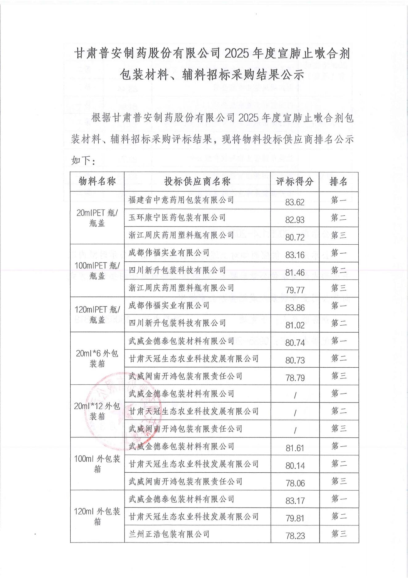 甘肅普安制藥股份有限公司2025年度宣肺止嗽合劑包裝材料、輔料招標(biāo)采購結(jié)果公示