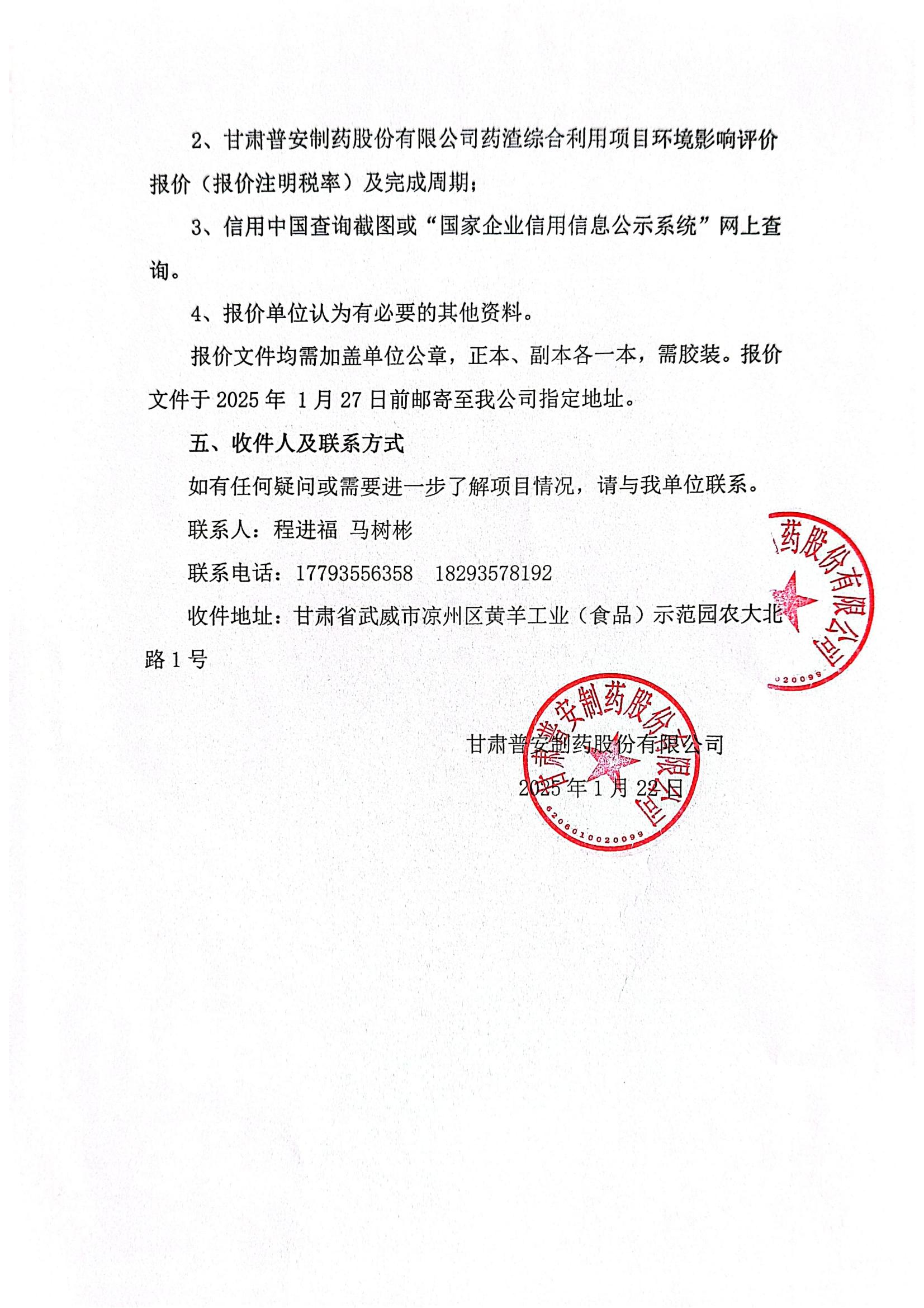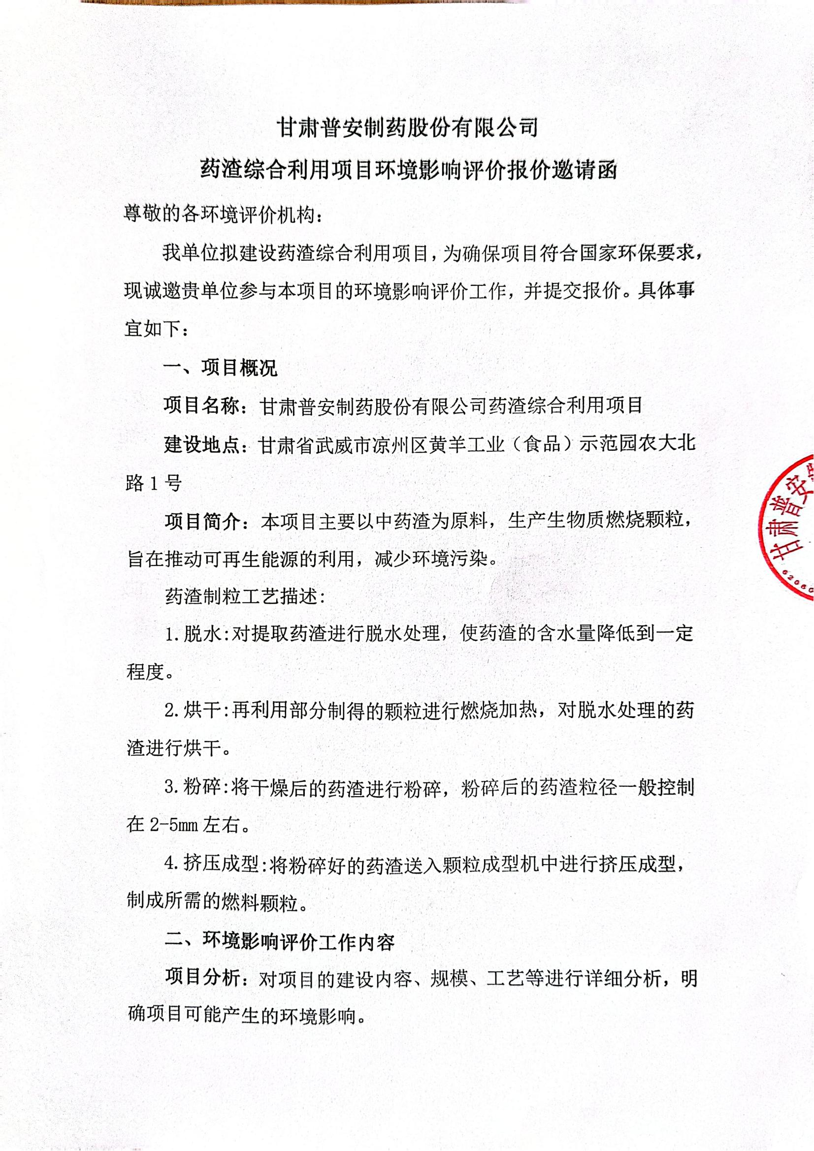 甘肅普安制藥股份有限公司藥渣綜合利用項目環(huán)境影響評價報價邀請函
