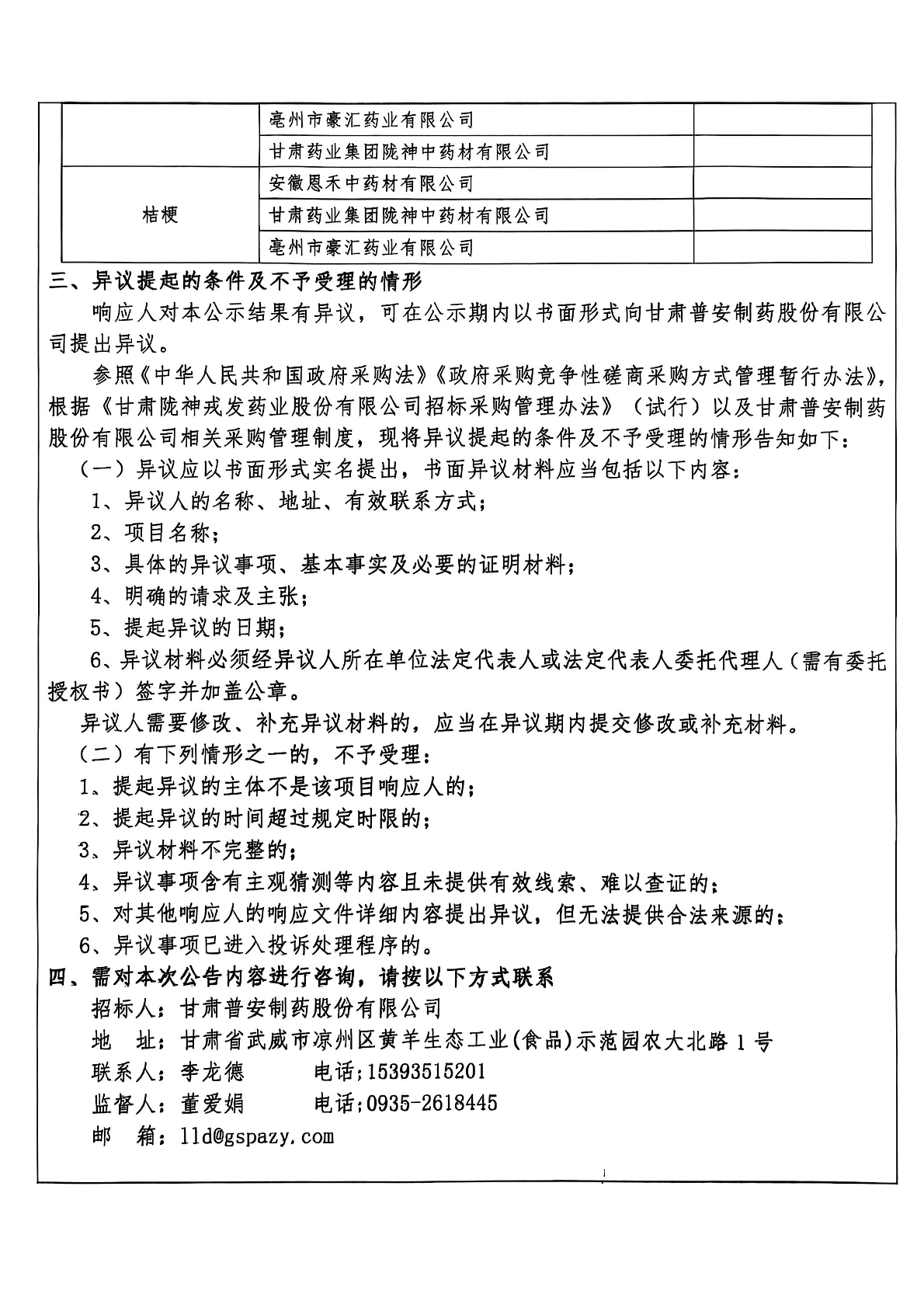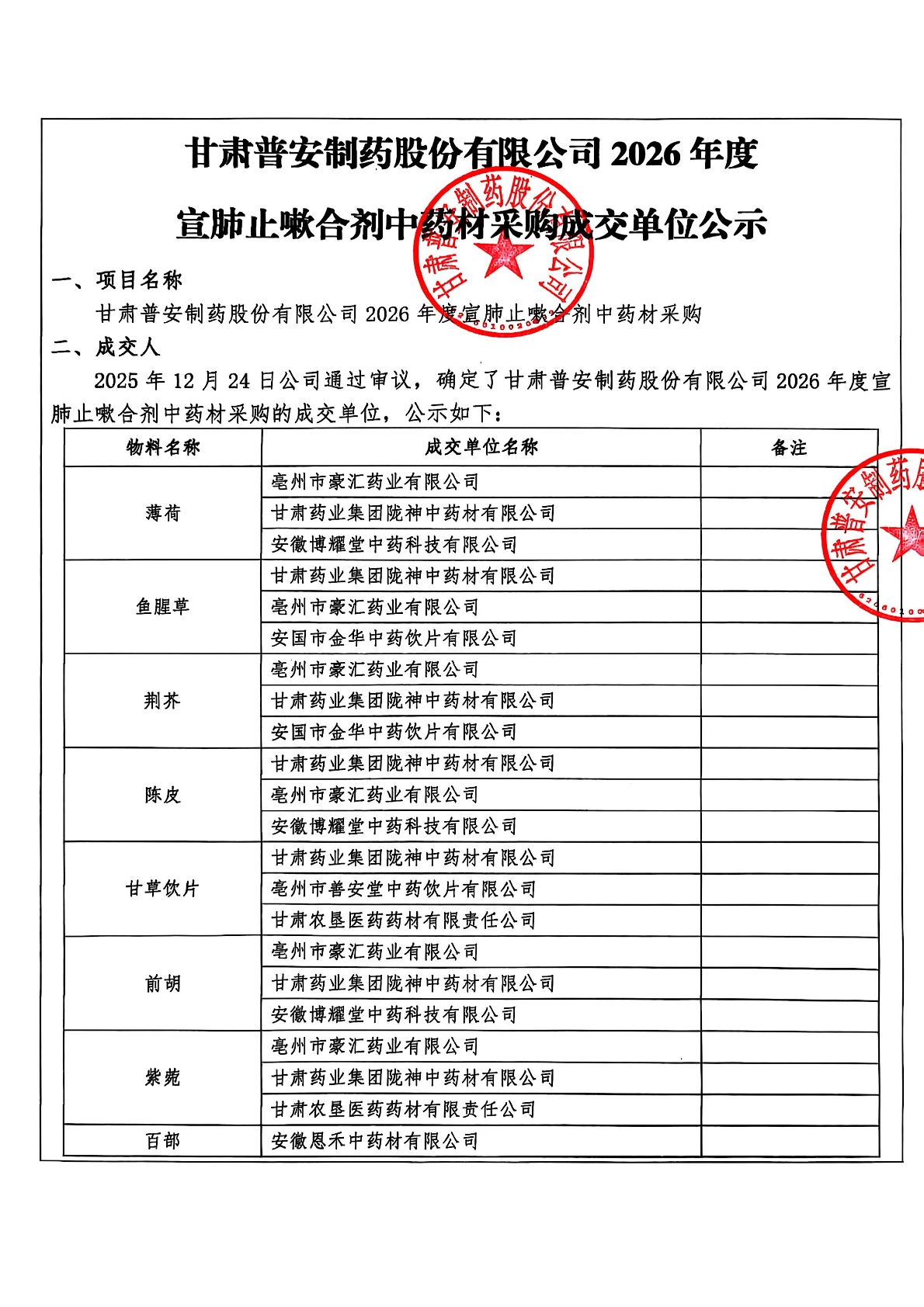 甘肅普安制藥股份有限公司2026年度宣肺止嗽合劑中藥材采購成交單位公示