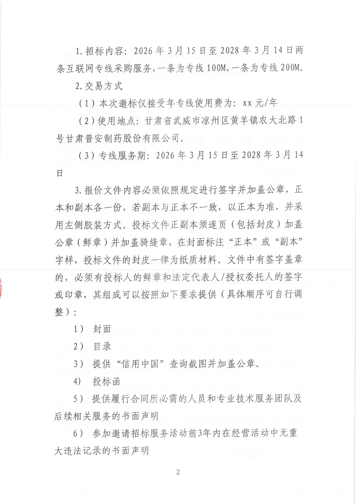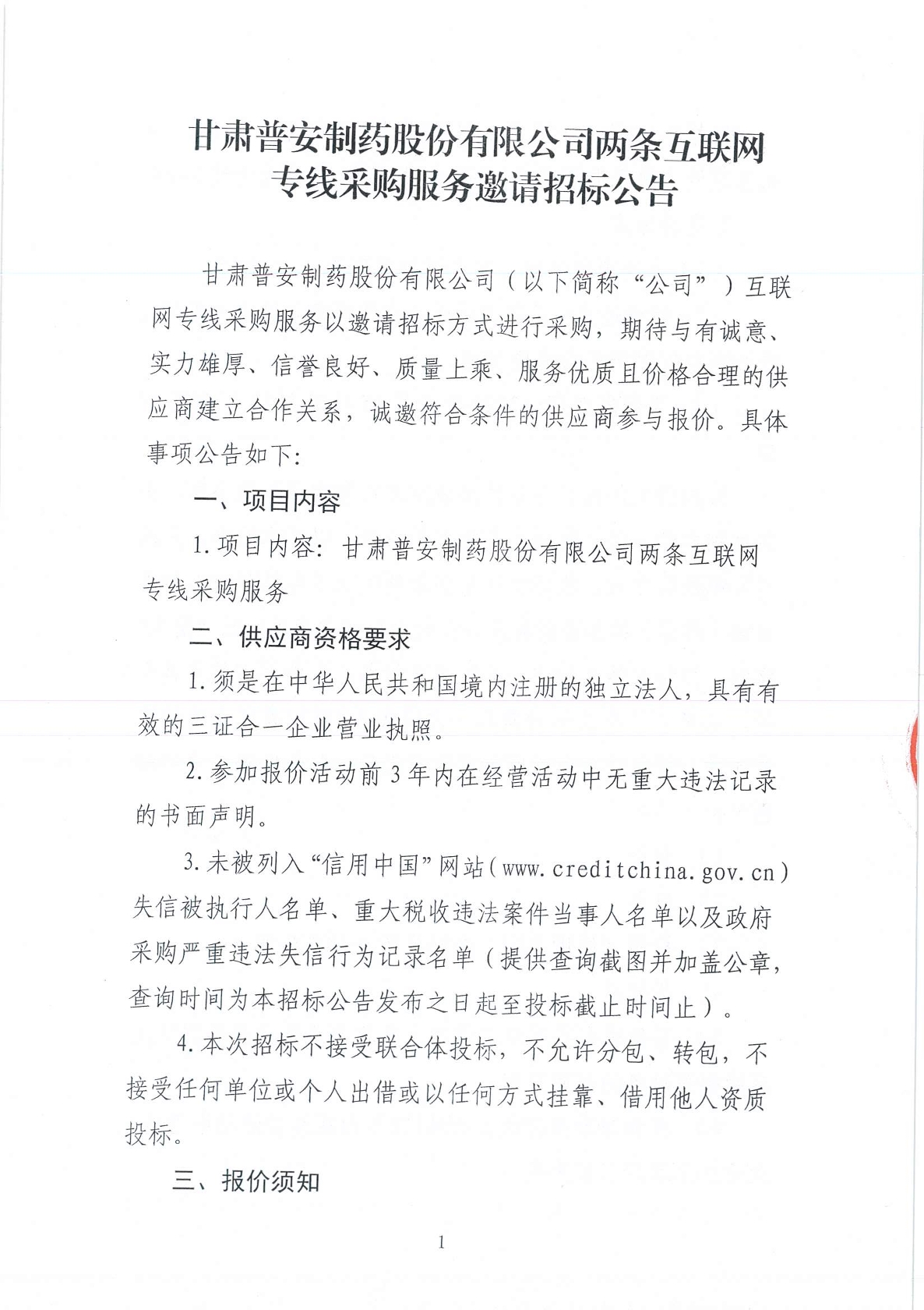 甘肅普安制藥股份有限公司兩條互聯(lián)網(wǎng)專線采購服務(wù)邀請招標(biāo)公告