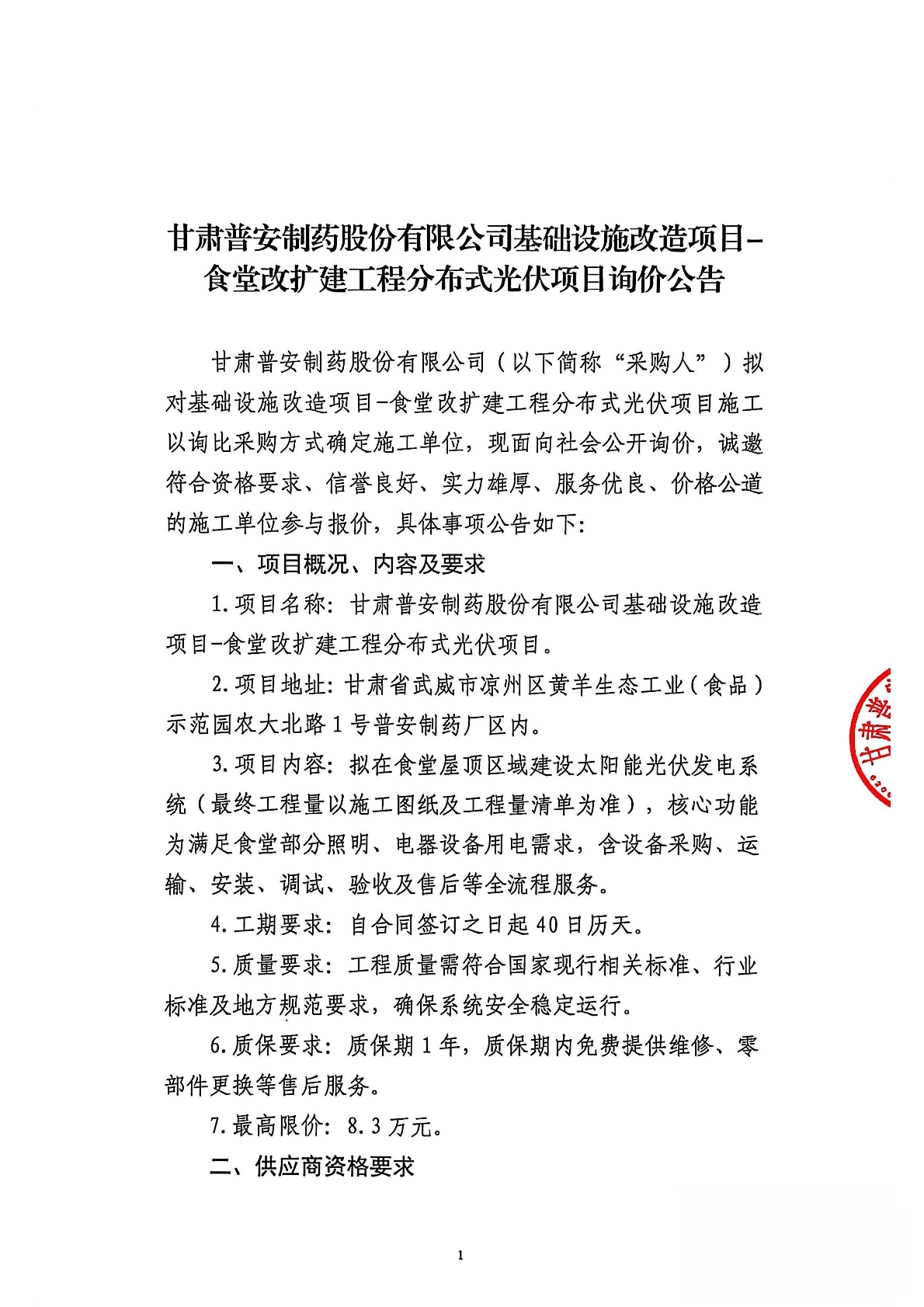 甘肅普安制藥股份有限公司基礎設施改造項目-食堂改擴建工程分布式光伏項目詢價公告
