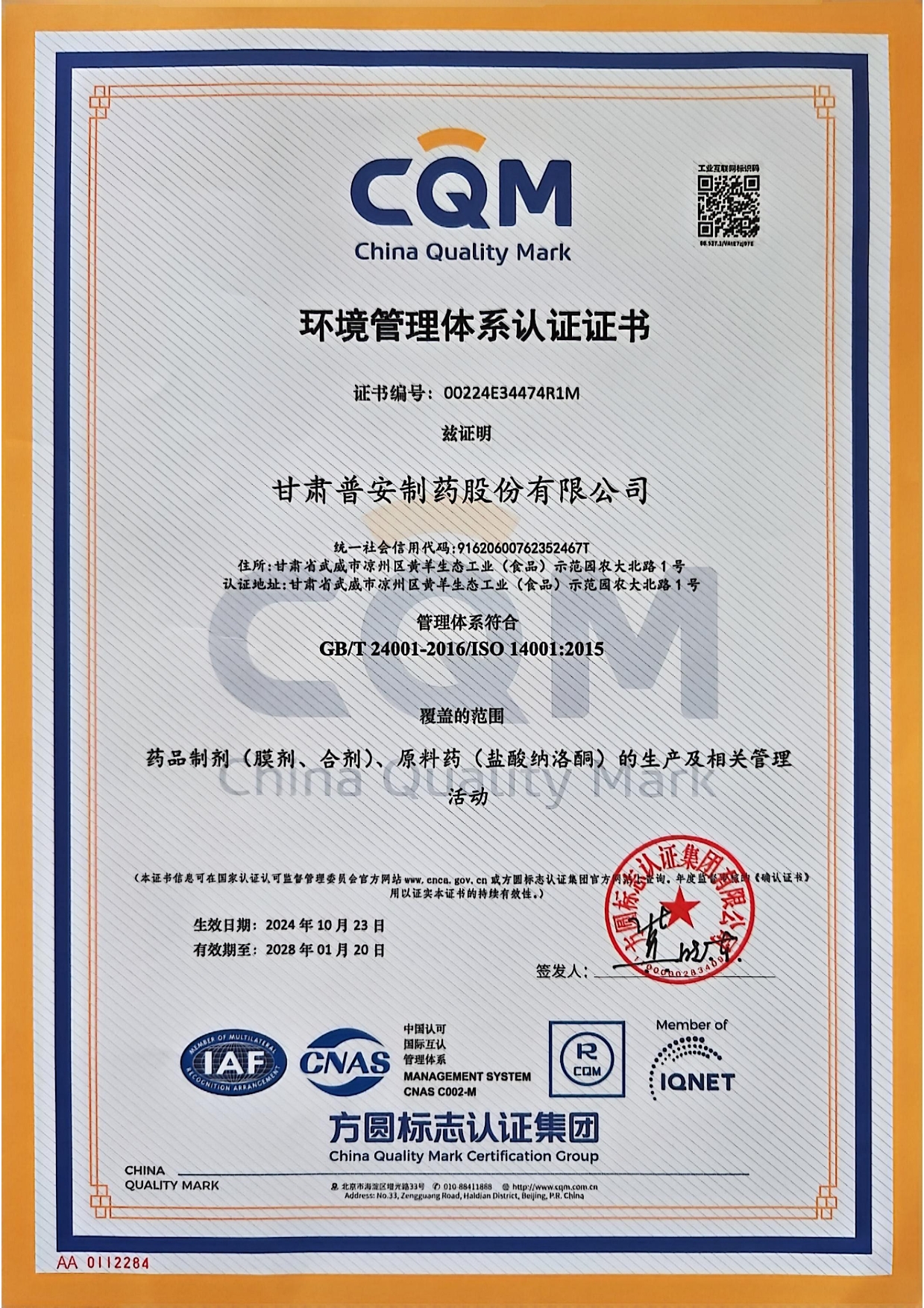 環境管理體系認證證書